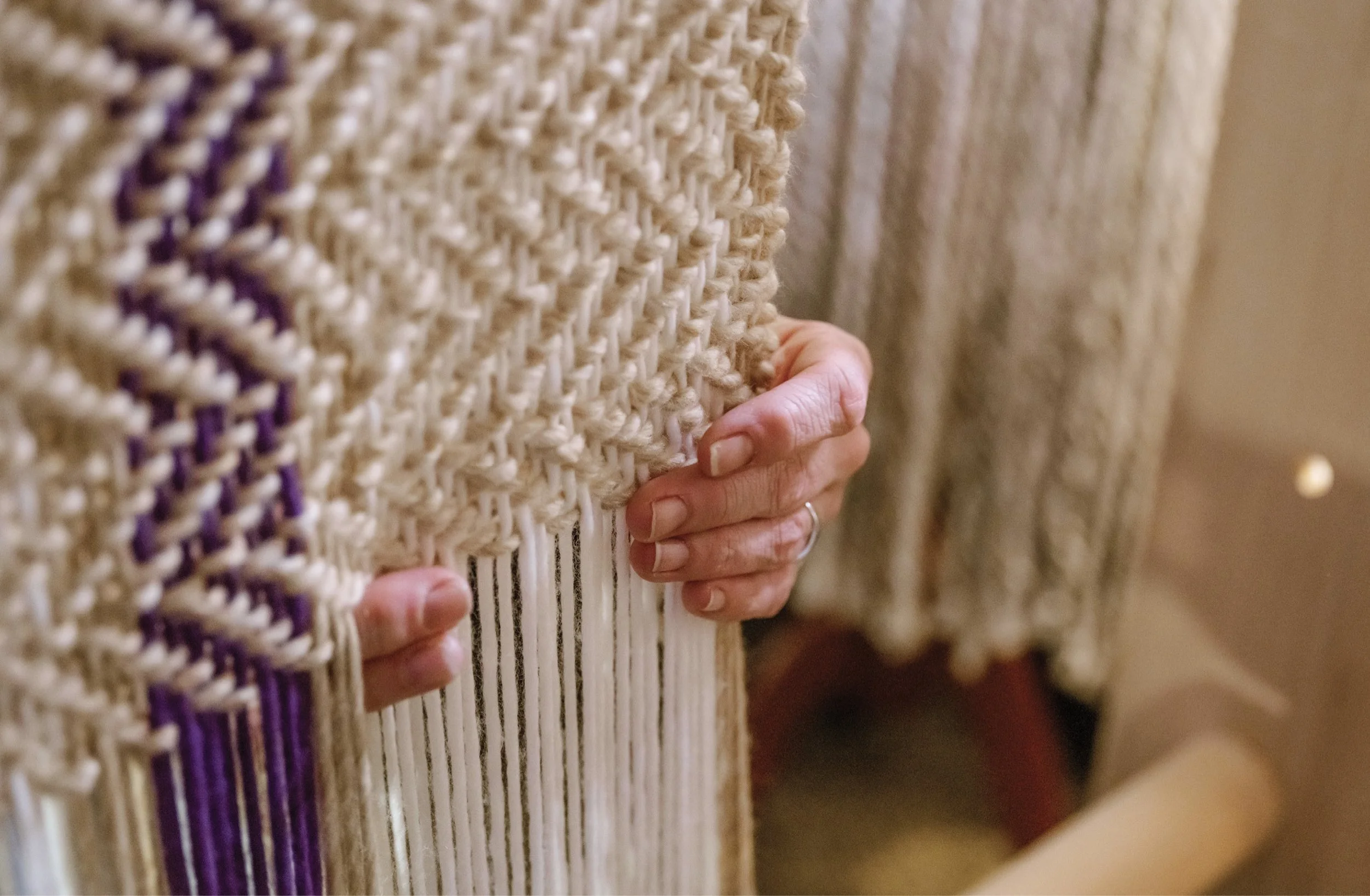 When she found Pavel and took her class, Sullivan says weaving “bit me, and after that I just kept going.” She began to acquire her own looms, from small frames to one nearly ceiling-high, with her partner Nick Miller helping to craft them mostly from pine and cedar.
